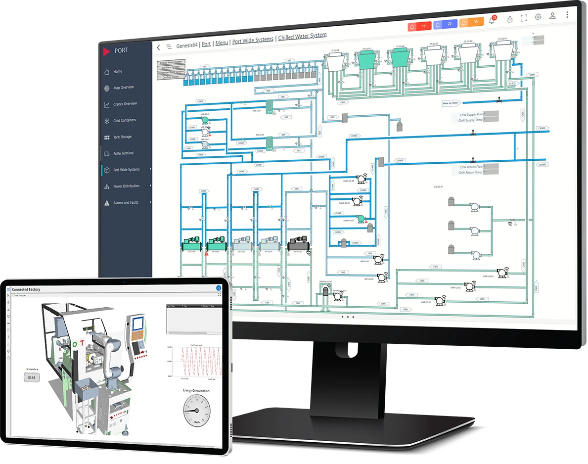 With GENESIS, existing data sources such as devices, industrial control systems, building management systems, databases and enterprise IT systems are accessed through configuration using standard interfaces and protocols. GENESIS unifies data collection and supervisory control across equipment, systems, and facilities through flexible modeling of real-time and historical data, alarms, and metadata. Displays and dashboards created in GENESIS can be developed once and securely accessed across operator workstations, web browsers, and mobile devices.