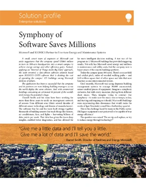 This document explains how a small, covert team of engineers at Microsoft applied an “Internet of Things meets Big Data” approach to invent a data-driven software solution based upon Mitsubishi Electric Iconics Digital Solutions' COTS software. This solution is slashing the cost of operating the campus’ 125 buildings saving Microsoft millions of dollars. The application has been so successful that the company and its partners are now helping building managers across the world deploy the same solution. And with commercial buildings consuming an estimated 40 percent of the world’s total energy, the potential is huge.